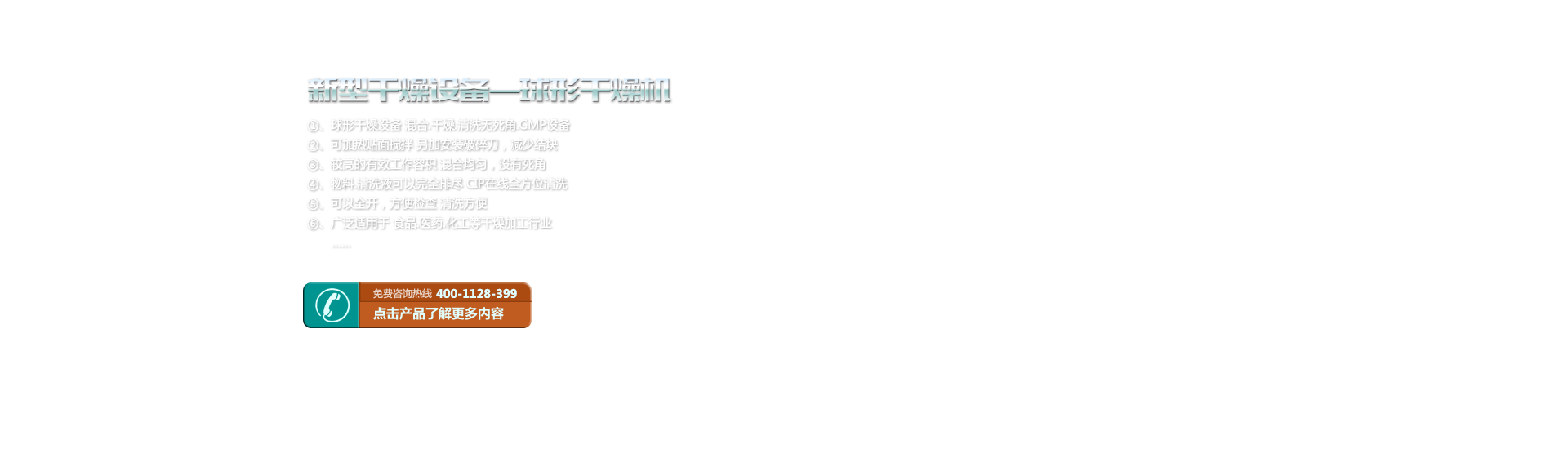 球形干燥機:因其形狀類似于球體而得名,球形干燥器、球型干燥機是目前干燥設備上比較新穎的一種,不但可以用于干燥,還可以用于混合,制粒等。與其他干燥設備相比,其具有物料適用性強,裝料系數高,干燥效果好,混合無死角,下料無殘留,易于清洗,符合cGMP要求等優點,但由于其技術要求高,加工難度較大,導致其售價較高,目前在國內應用較少。